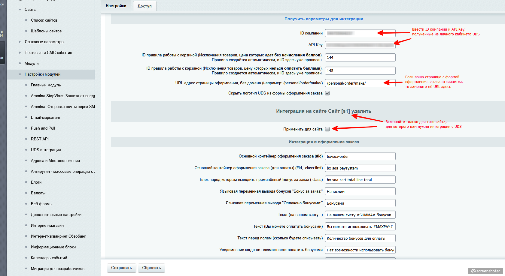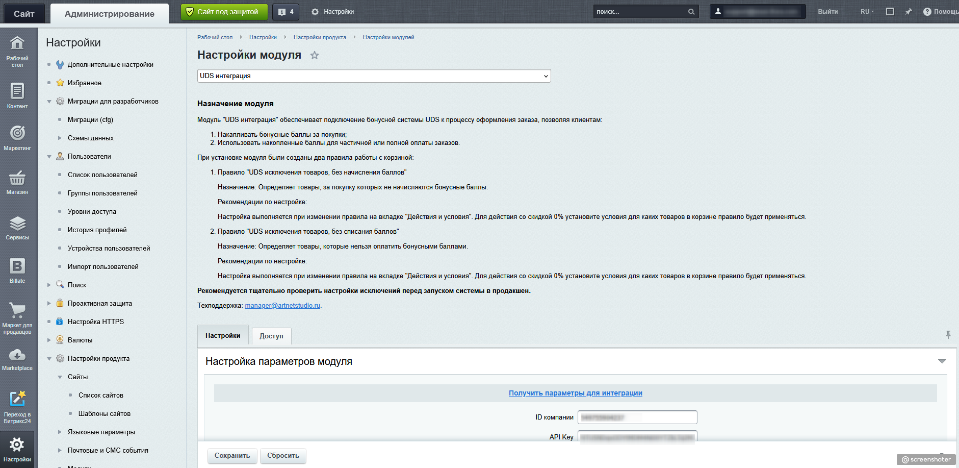 После установки модуля на сайте в настройках панели управления появится новый раздел с настройками бонусной системы "UDS интеграция". Ее необходимо настроить и включить у необходимых сайтов.