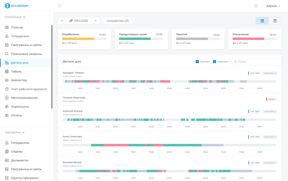 «ИНСАЙДЕР» покажет, как распределялась нагрузка в течение дня На диаграмме активности видно время максимальной и минимальной нагрузки работников. Вы всегда сможете вернуться к статистике каждого дня недели или месяца, а также к данным по часам в рамках одного дня. | ![]() |