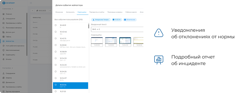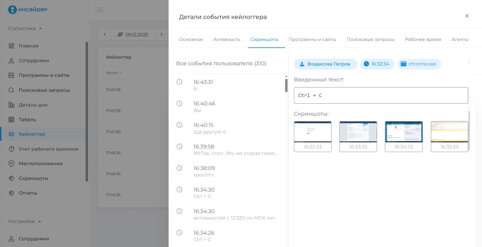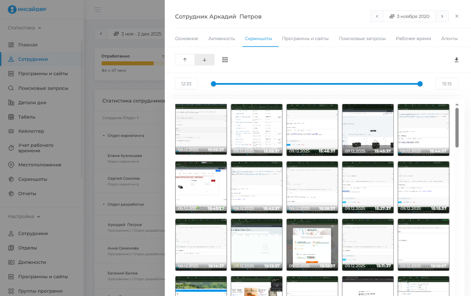 Вы сможете видеть экран компьютера каждого сотрудника Инсайдер оснащен особыми функциями для записи и воспроизведения действий. Вы в любой момент сможете посмотреть скриншоты экрана компьютера интересующего вас сотрудника. | ![]() |