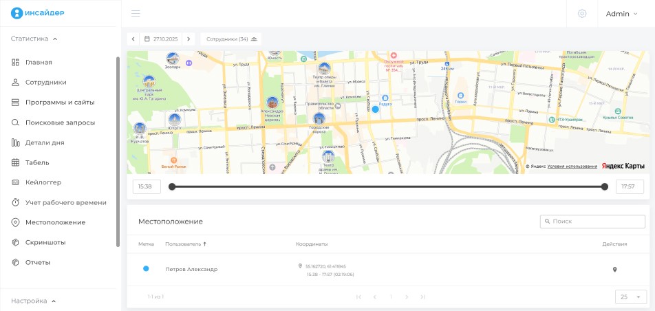 Отображает текущее местоположение персонала, а также географию