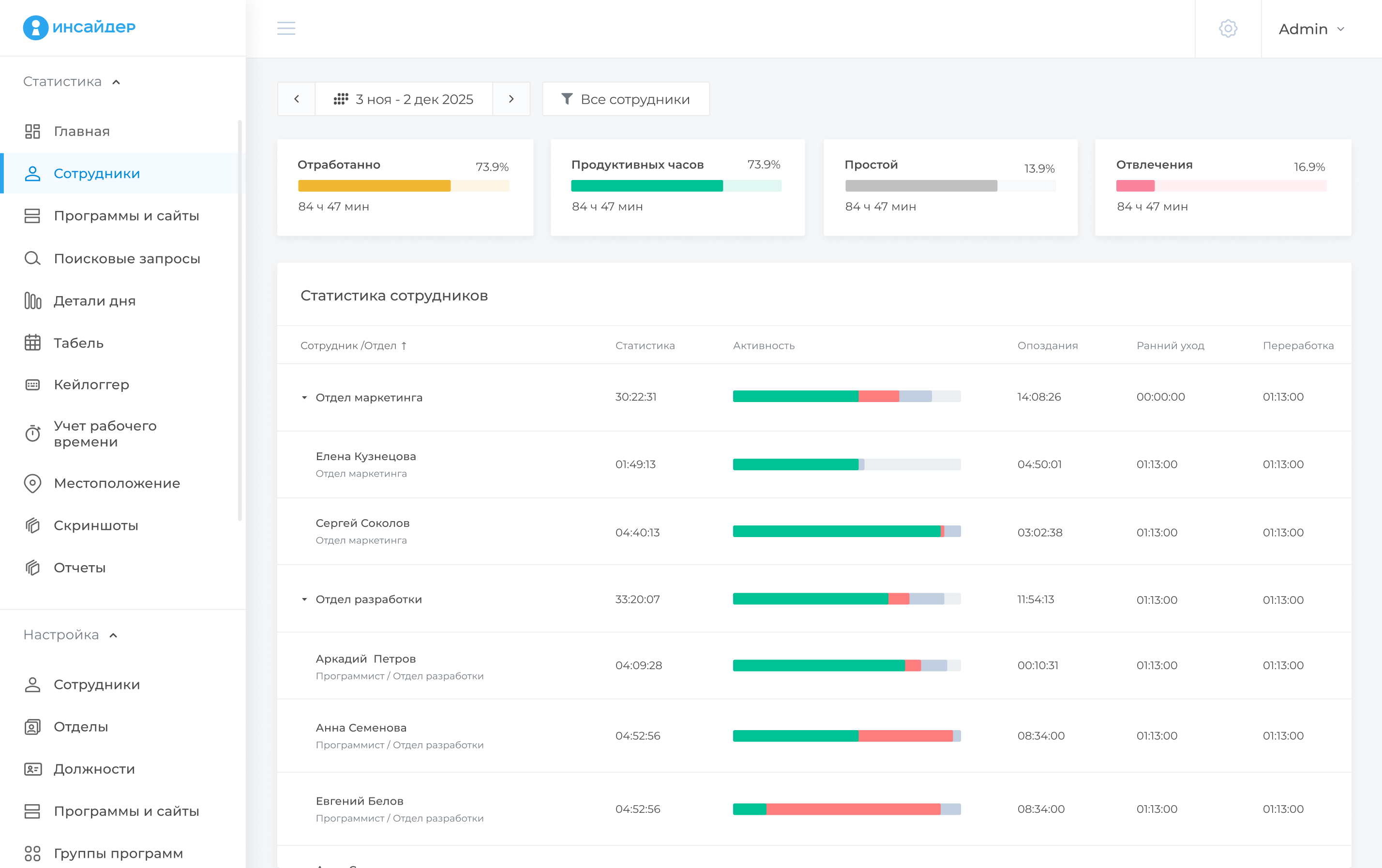 | Система мониторинга детально повторяет структуру вашей компании. Отделы раскрываются по сотрудникам в один клик. Помимо подсчета рабочего временив целом, система разделит день на продуктивные часы и время отвлечений. |