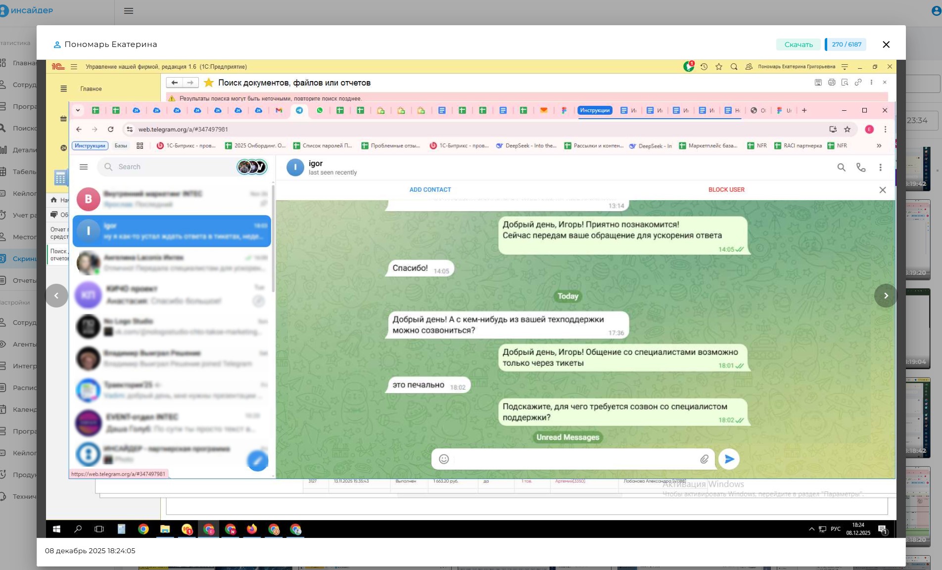 Вы сможете видеть экран компьютера каждого сотрудника Инсайдер оснащен особыми функциями для записи и воспроизведения действий. Вы в любой момент сможете посмотреть скриншоты экрана компьютера интересующего вас сотрудника. | ![]() |