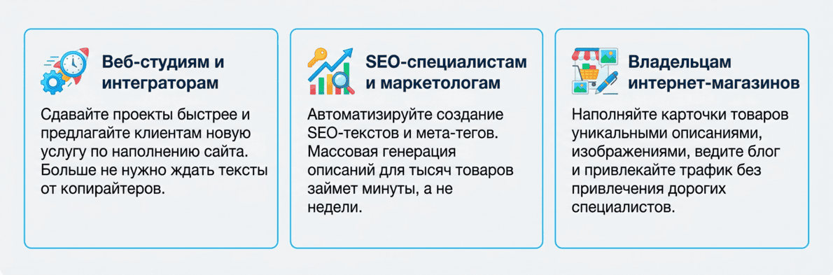 Стоимость модуля окупается за 1-2 задачи. Вы не только экономите на копирайтерах, но и заменяете 5-6 платных подписок на разные ИИ-сервисы одним удобным инструментом.